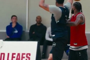 小卡炫耀自己的恐怖大手掌,一旁的保罗估计很羡慕吧